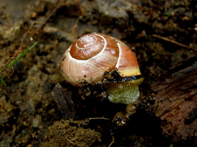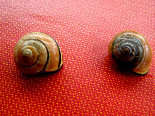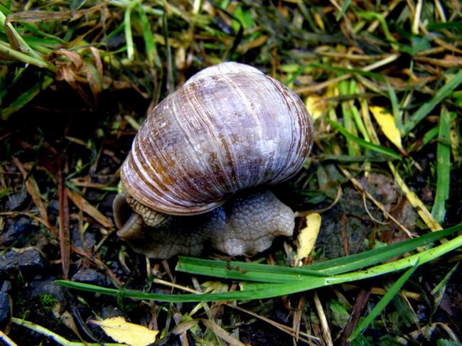 ![]() <- und oben: Weinbergschnecke (Helix pomatia Linnaeus), Gattung Helix, leider kam sie nicht richtig aus ihrem Haus heraus (08/07) |