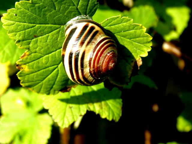 <- Bänderschnecke, ca. 1 cm groß auf einem Blatt (10/07) |