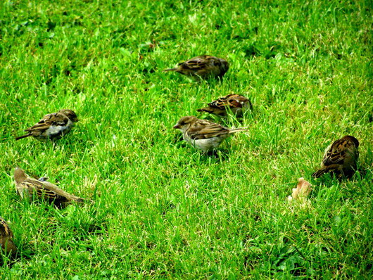 ![]() <- und unten: der Buchfink sucht im Rasen nach Fressbarem eide 03/08) ![]() ![]() <- eine Schar Spatzen hat sich auf der Wiese eingefunden, um nach Futter zu suchen (08/07) |