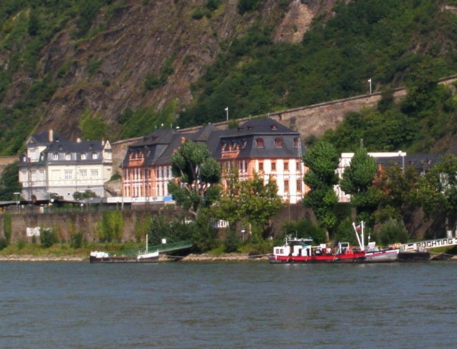 ![]() unterhalb der Festung Ehrenbreitstein am Rhein (von links nach rechts) fürstliche Bauten: das Pagenhaus, der Dikasterialbau, dahinter der Krummstall und ganz rechts hinter den Bäumen der Marstall |